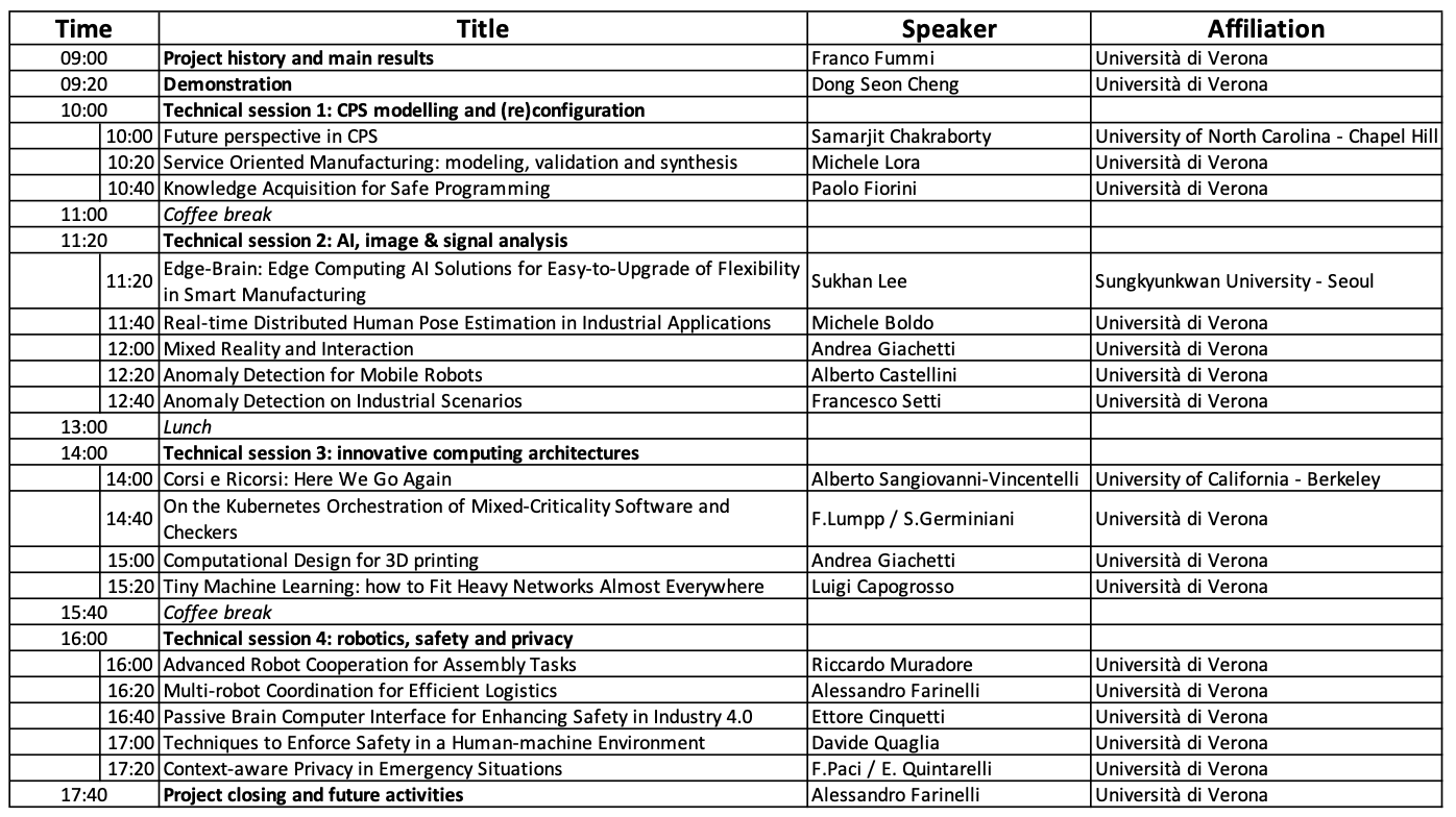 Fourteen technical presentations are scheduled covering all main topics of the project, that is: Cyber-physical systems