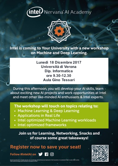 Intel is coming to University of Verona with a new workshop on Machine Learning and Deep Learning. Join us for a drink, learning and experience sharing!